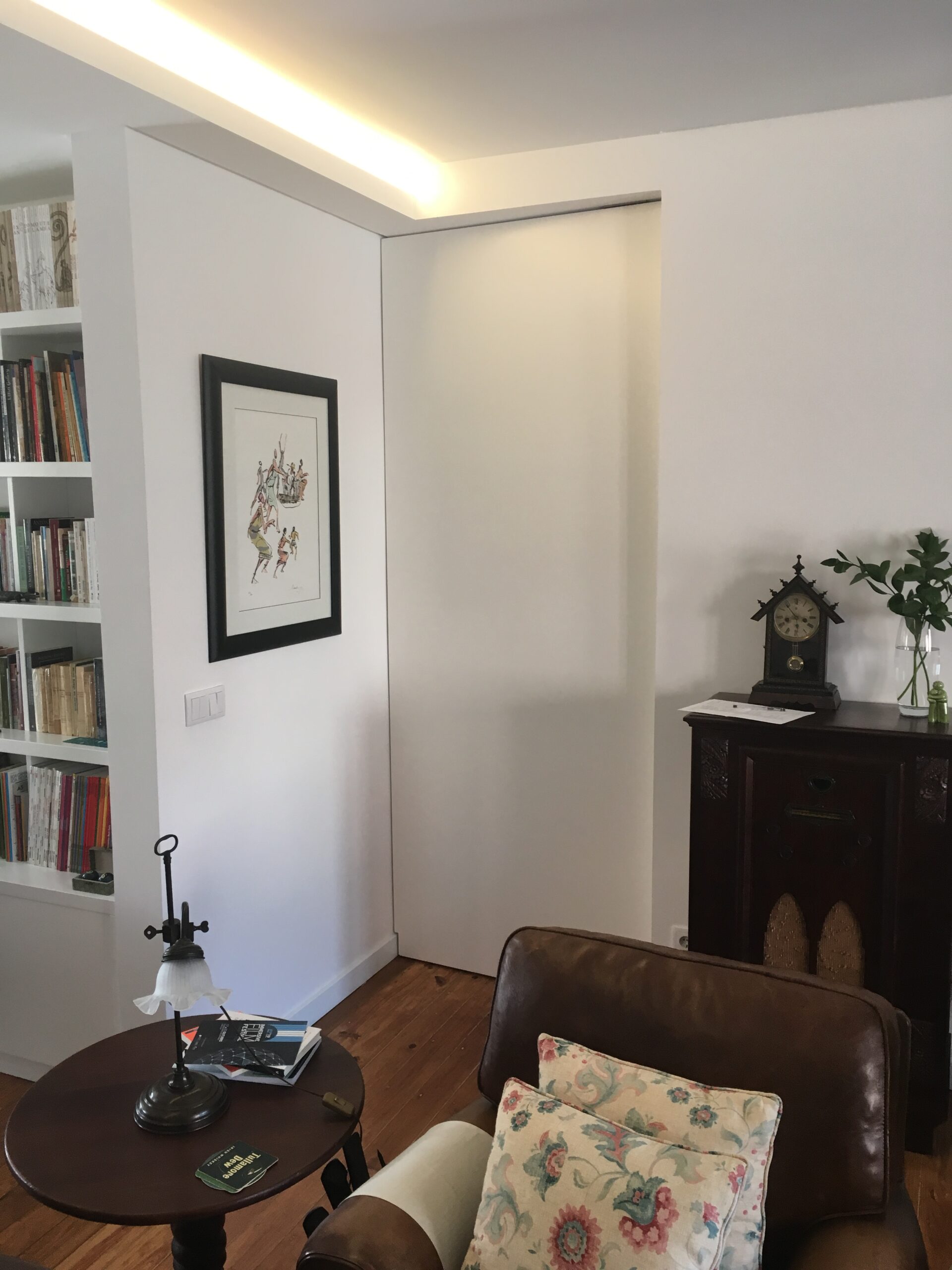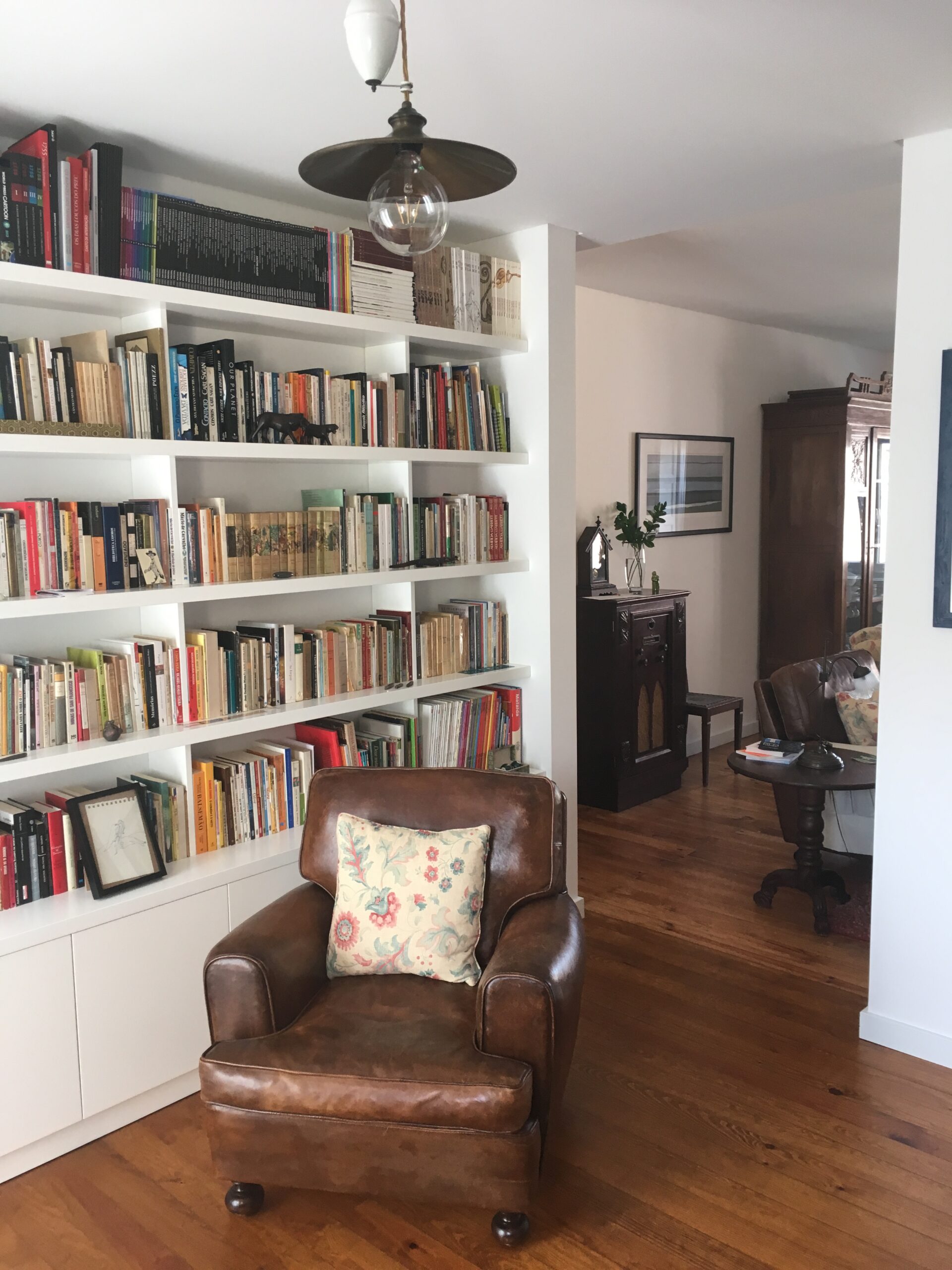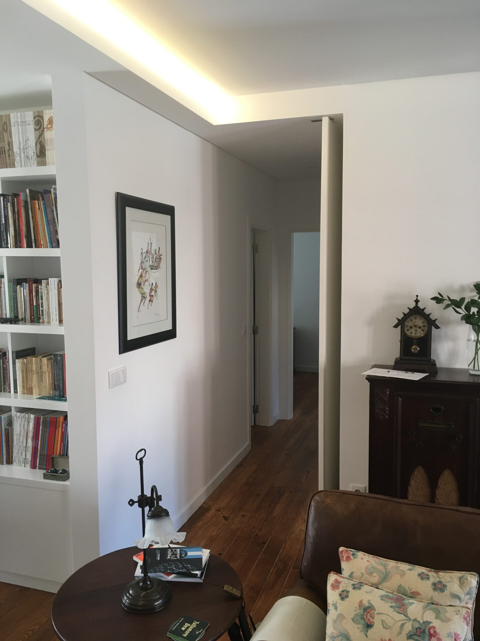 O interesse dos proprietários em introduzir peças de mobiliário clássico e por algumas características originais do apartamento, criaram um contraste entre a madeira dos móveis com o branco e as linhas simples e sóbrias das paredes e das novas carpintarias.