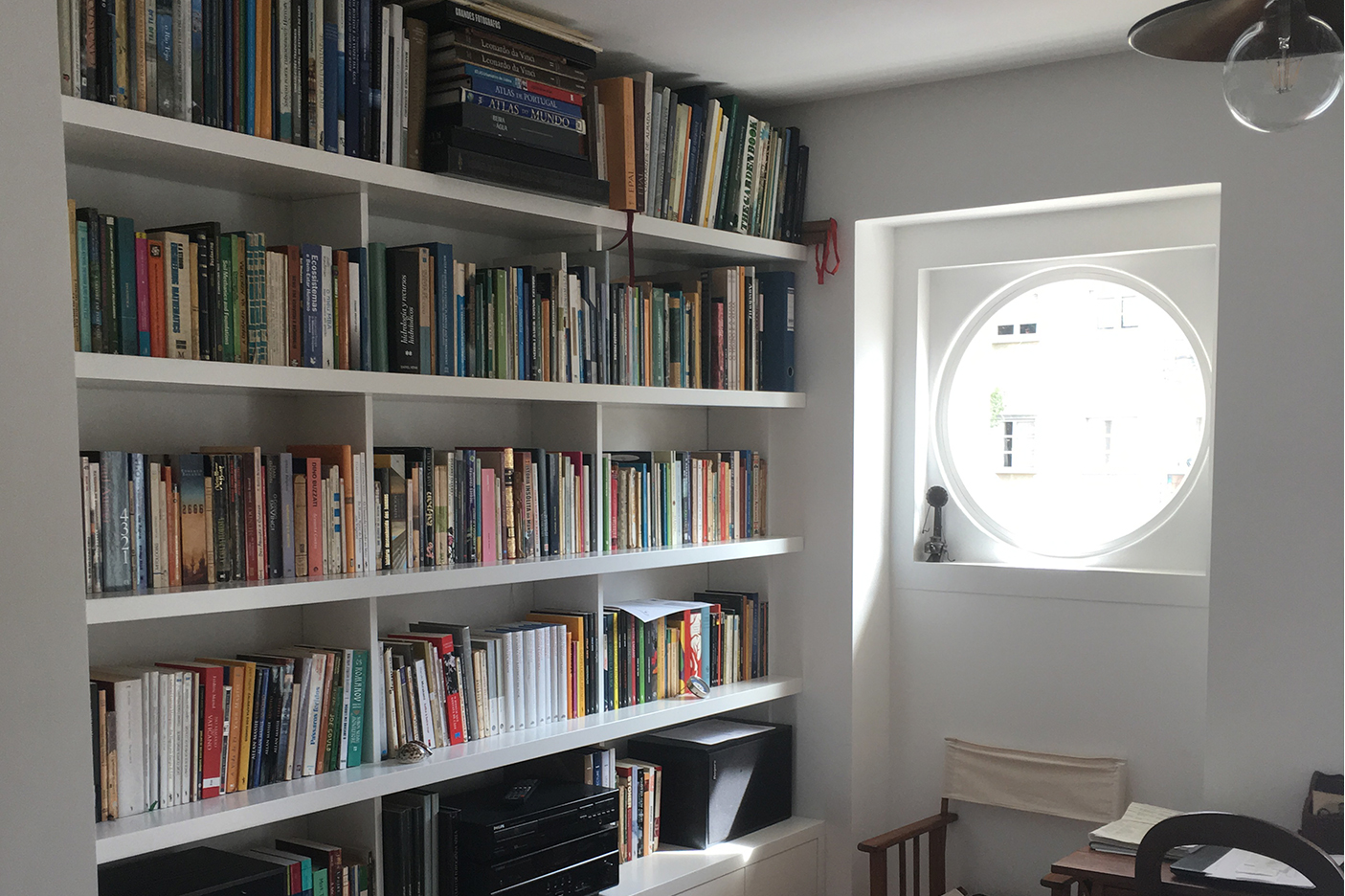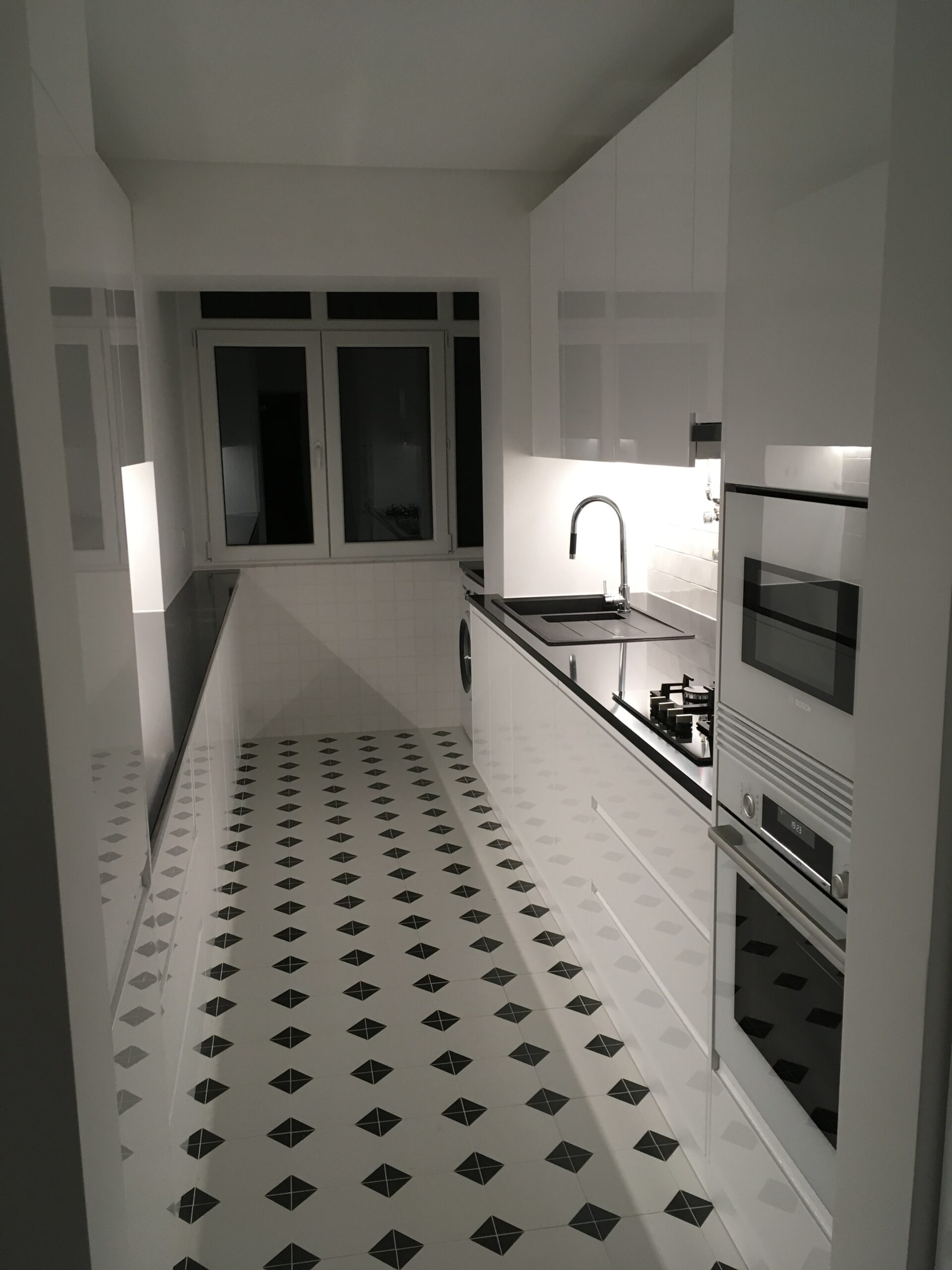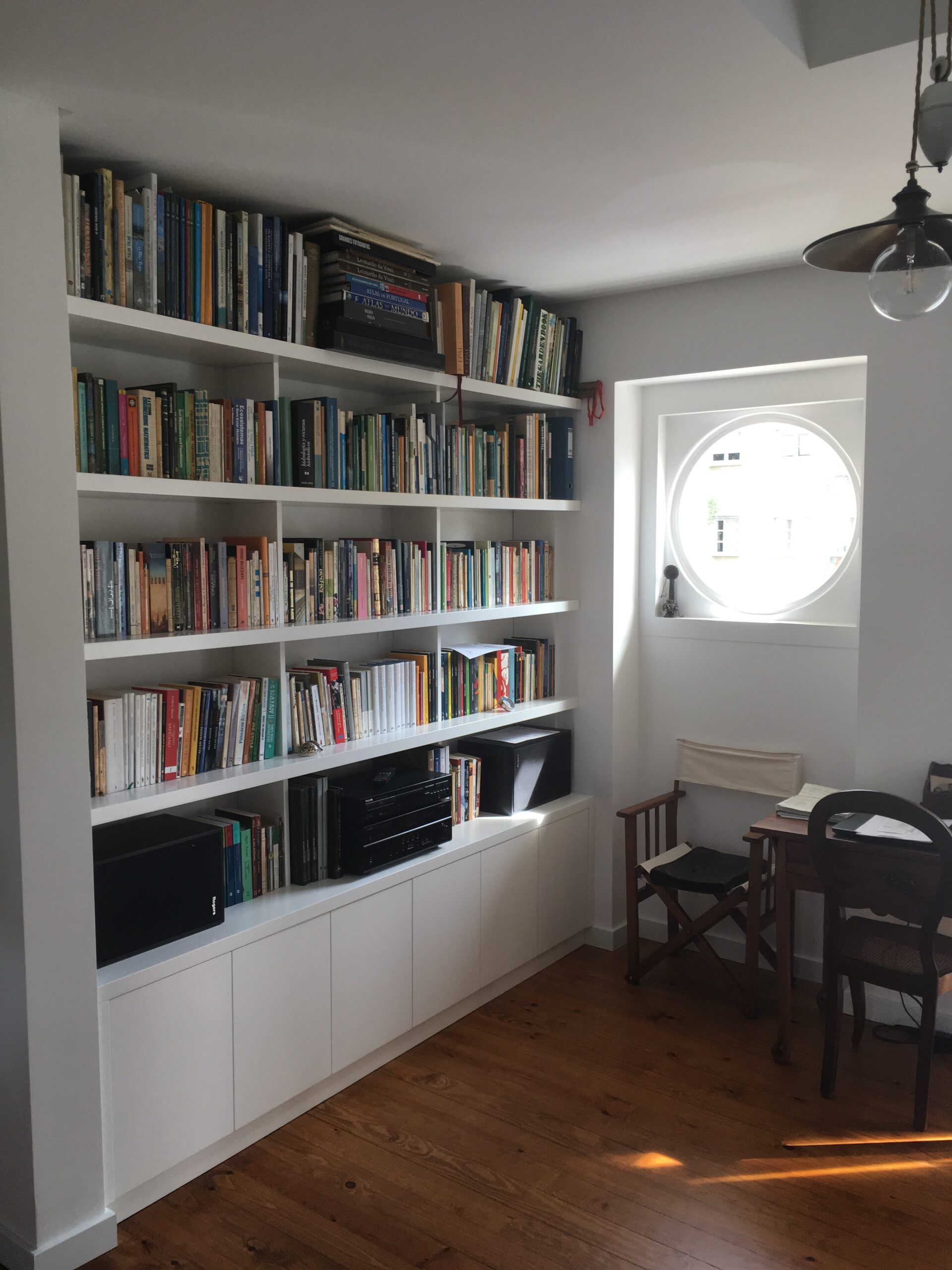 O interesse dos proprietários em introduzir peças de mobiliário clássico e por algumas características originais do apartamento, criaram um contraste entre a madeira dos móveis com o branco e as linhas simples e sóbrias das paredes e das novas carpintarias.