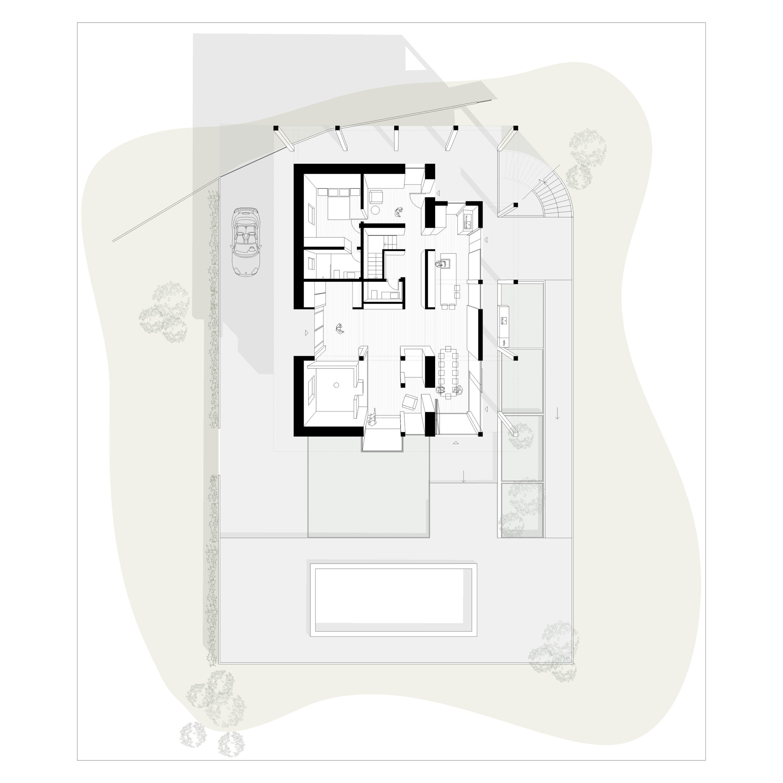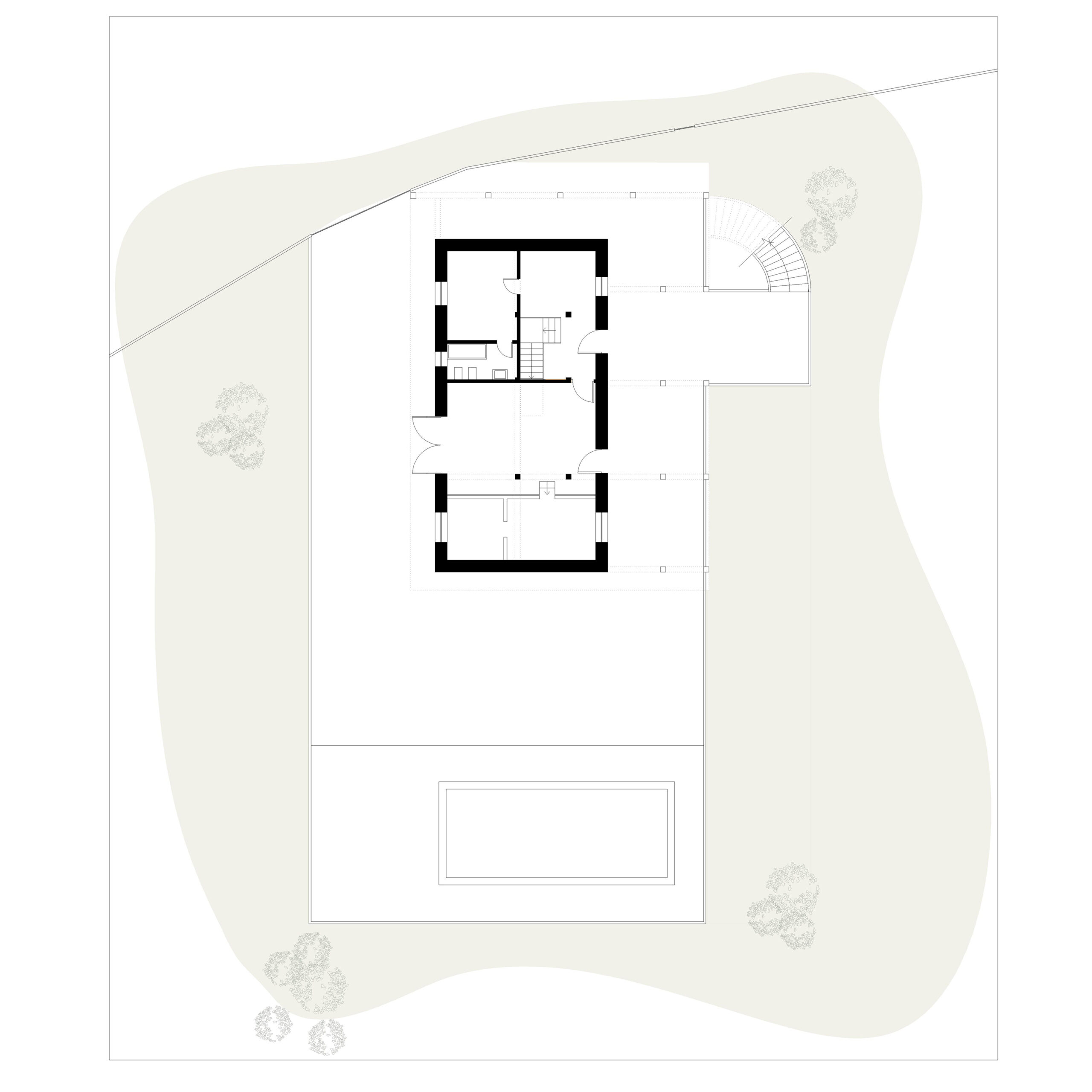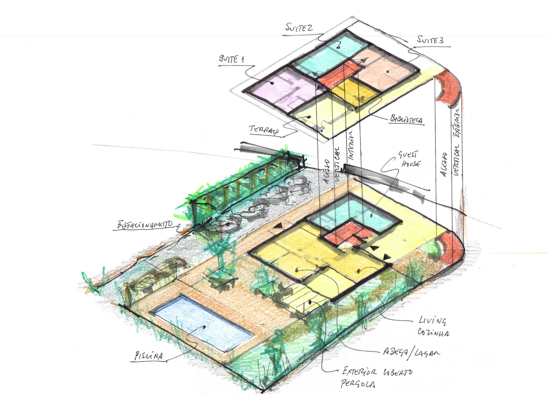 No rés-do-chão prevê-se a criação de um espaço franco entre a sala de estar, o hall de entrada, a adega original, a cozinha, a sala de jantar e o nicho destinado às crianças, tendo sempre em mente a intenção de uma relação fluida e quase impercetível dos espaços interiores com os exteriores.