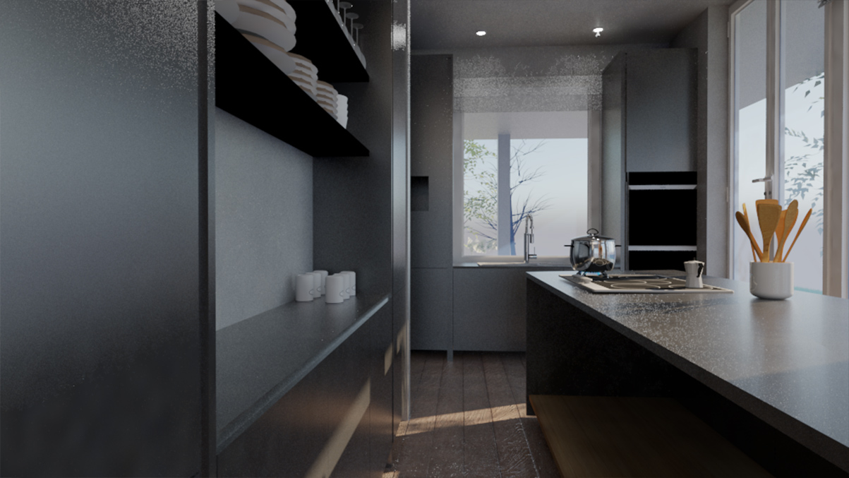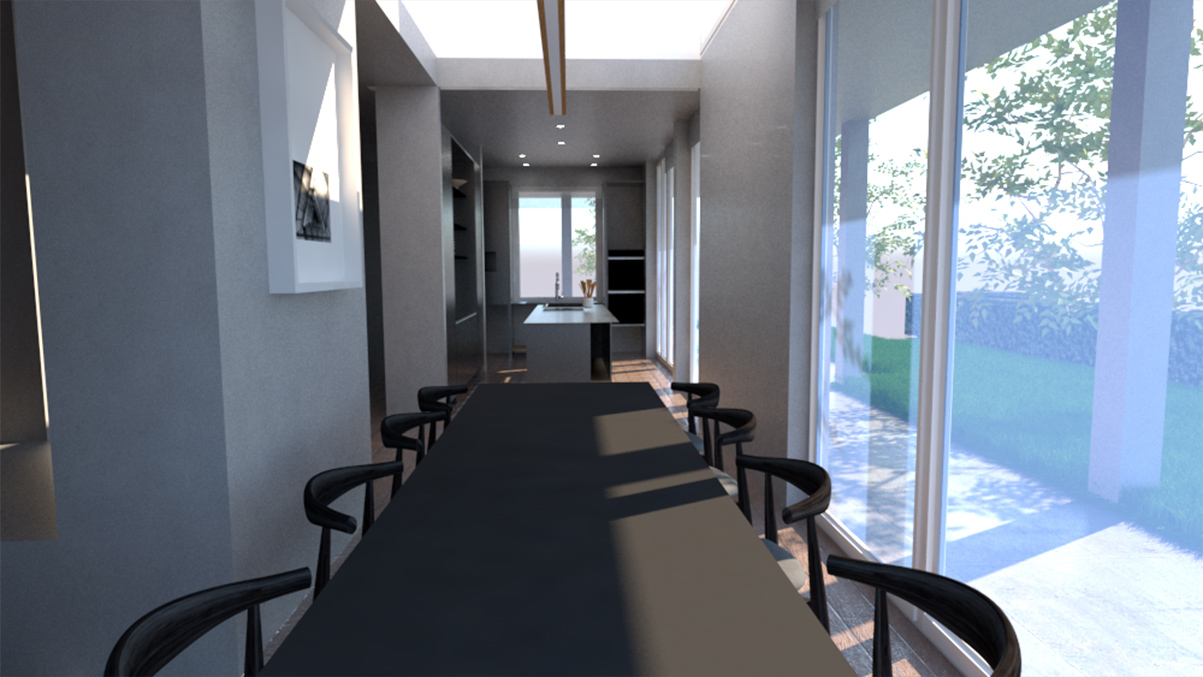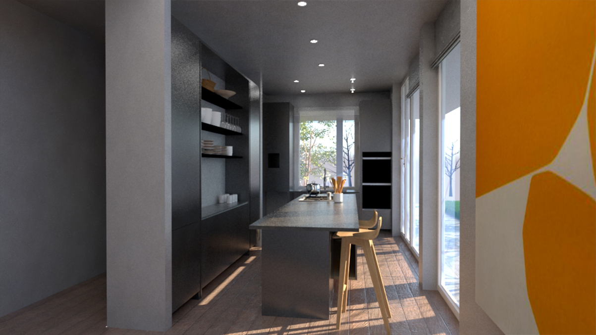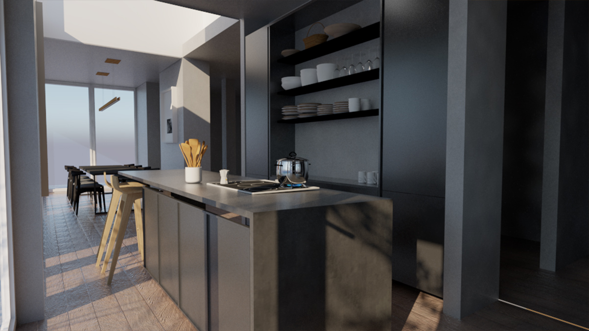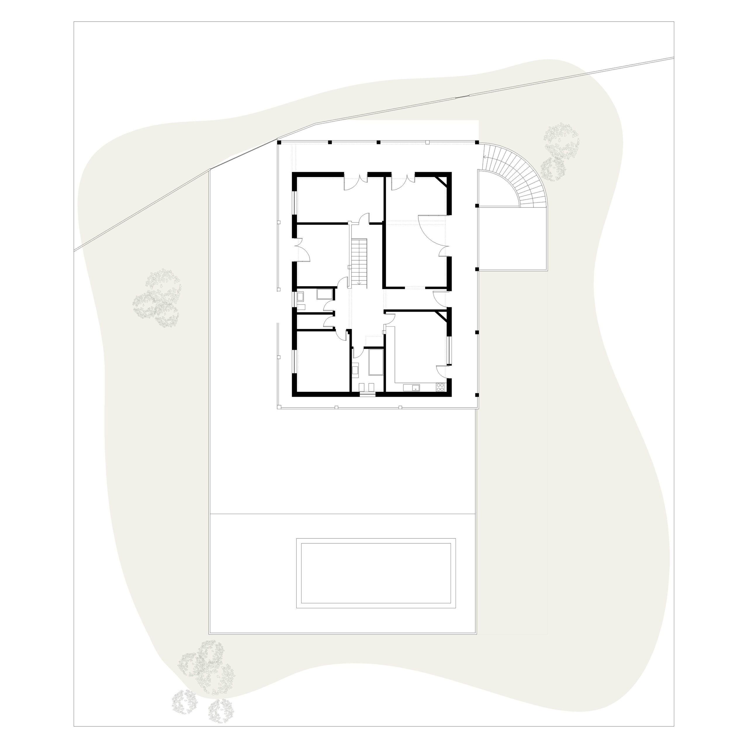 No rés-do-chão prevê-se a criação de um espaço franco entre a sala de estar, o hall de entrada, a adega original, a cozinha, a sala de jantar e o nicho destinado às crianças, tendo sempre em mente a intenção de uma relação fluida e quase impercetível dos espaços interiores com os exteriores.