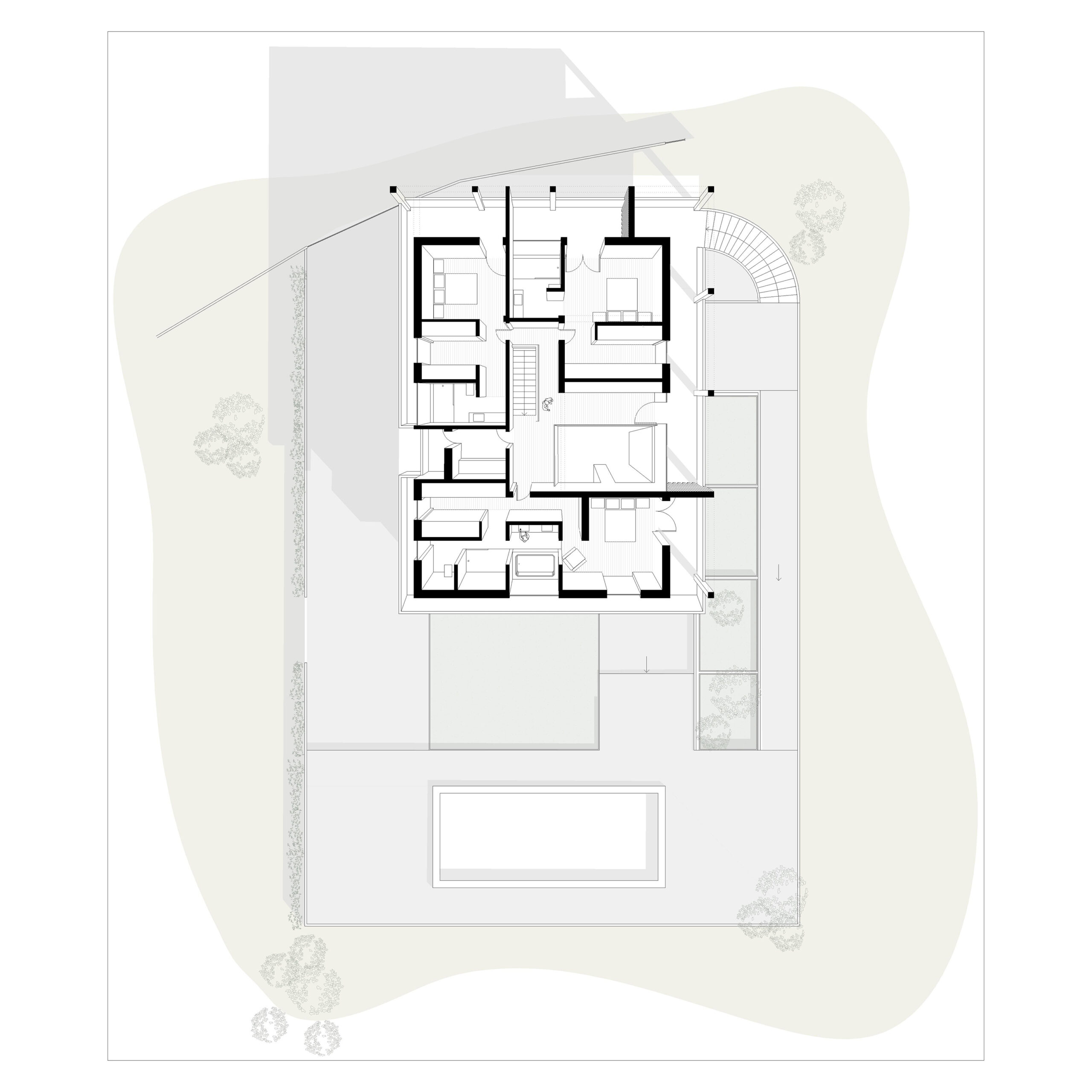 No piso superior será feita uma reorganização espacial, configurando a área privada da casa, criando-se três quartos com a sua própria instalação sanitária, closet e varanda privativa. O tratamento de roupa e um espaço de biblioteca encontram-se também no primeiro piso.