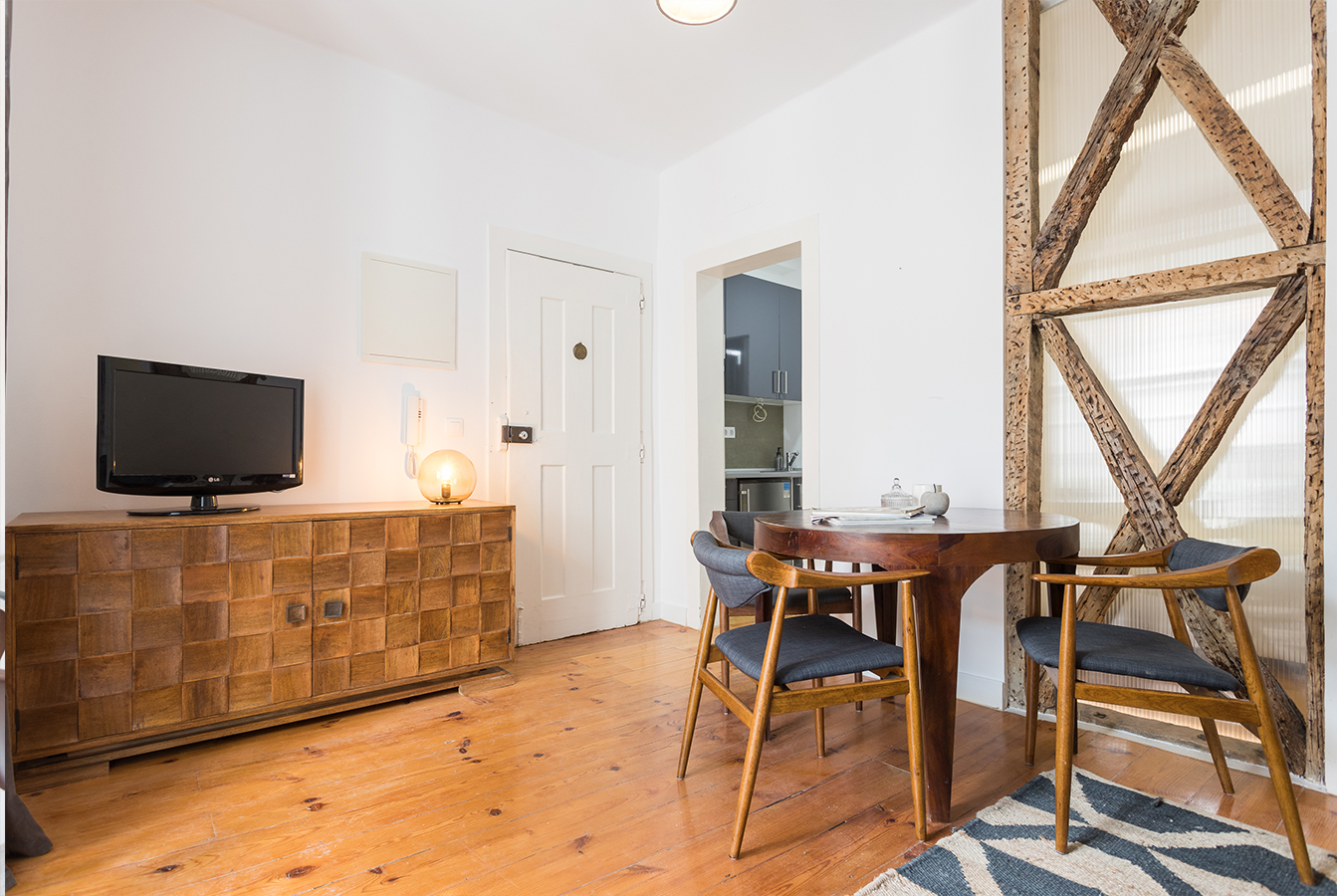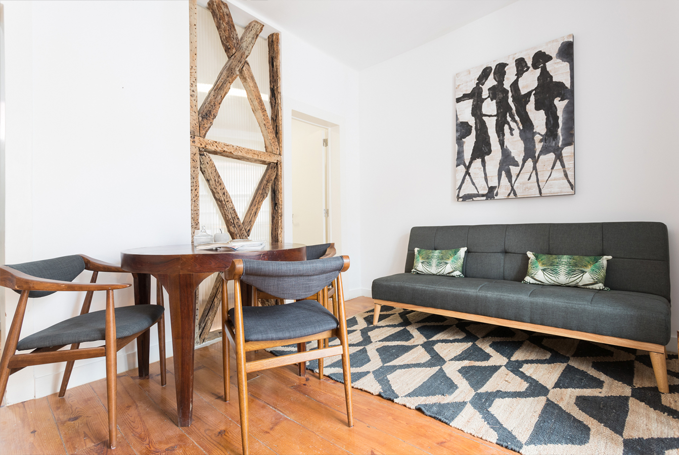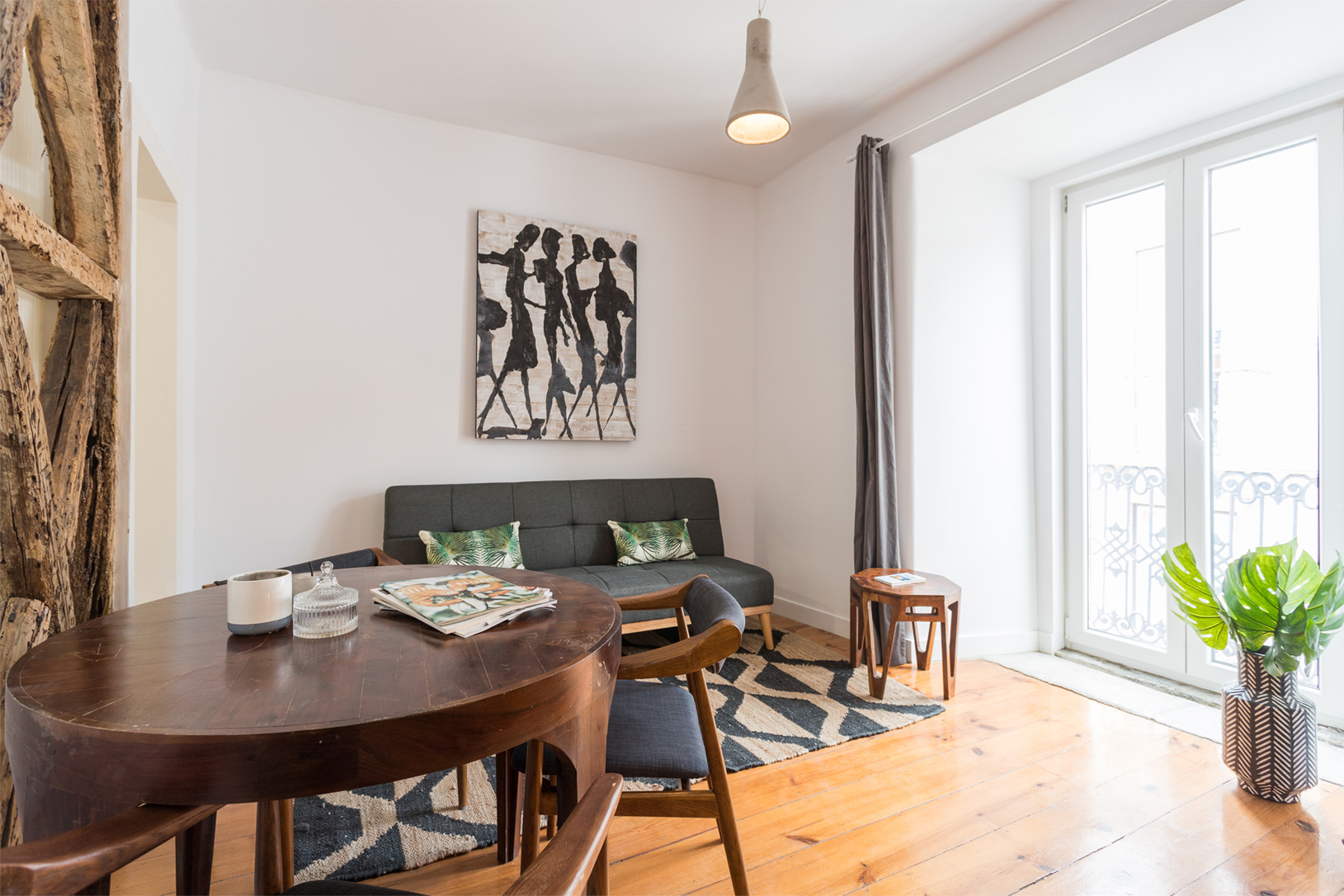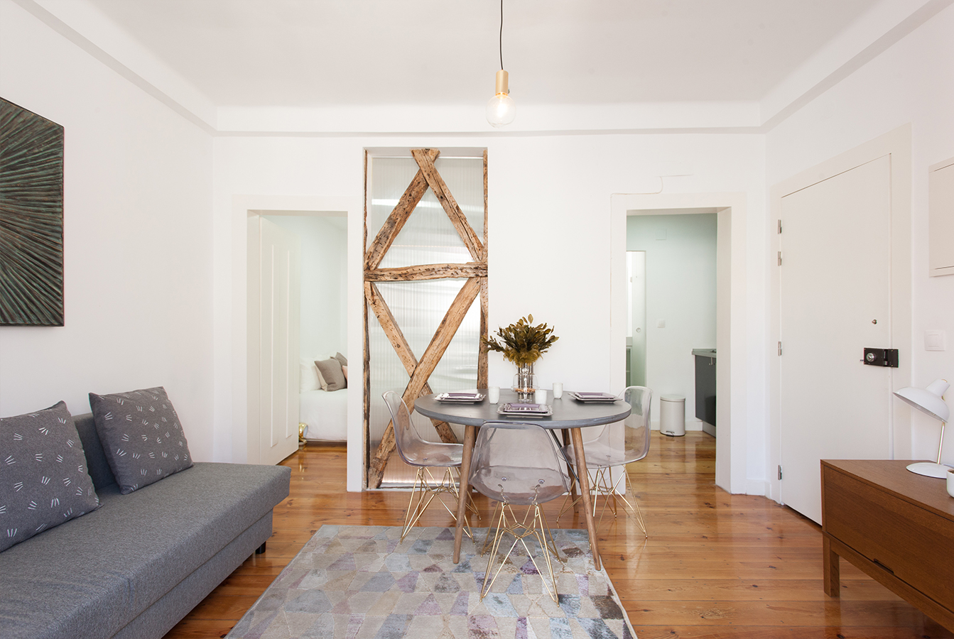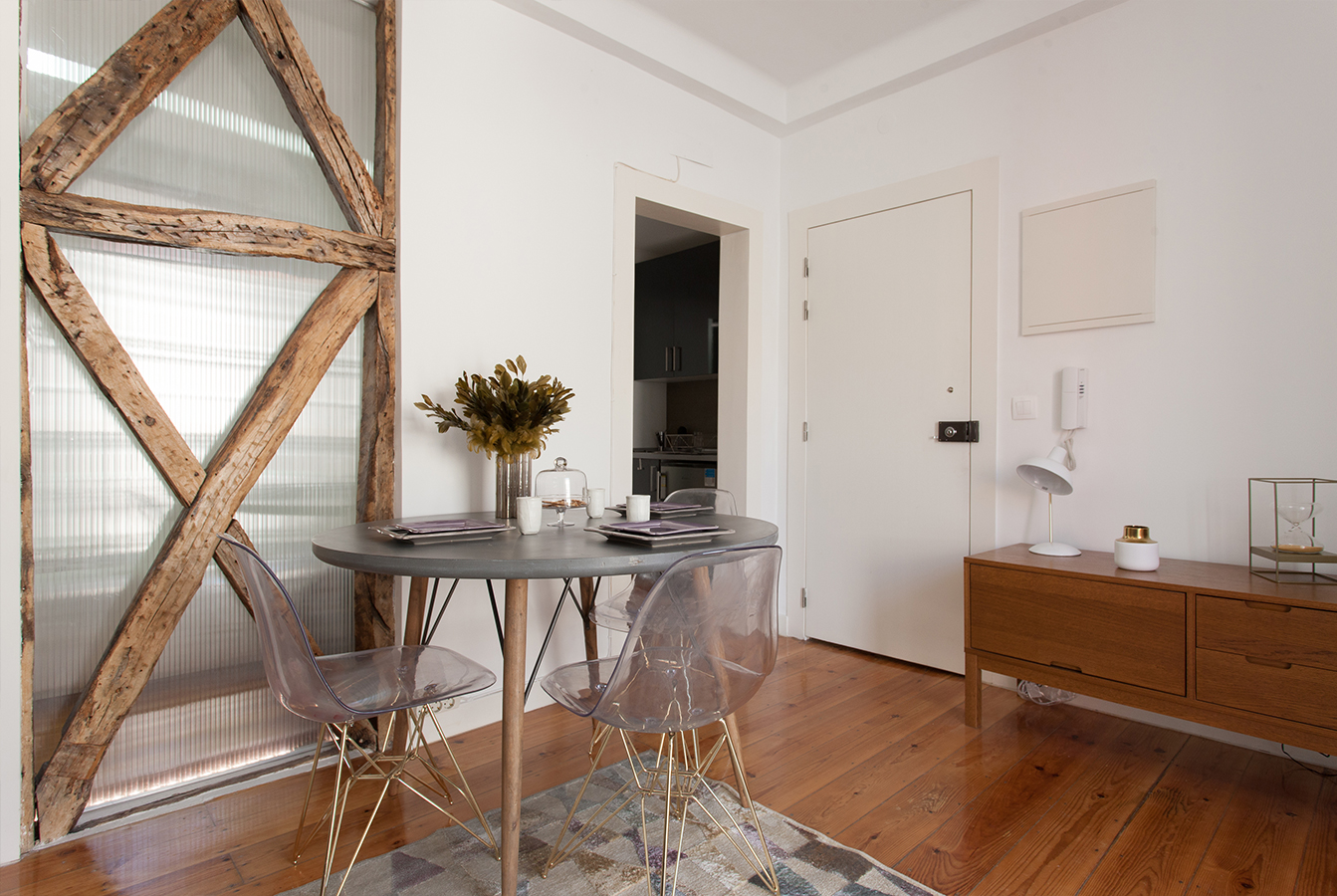 As estruturas de Cruz de Santo André, características deste edifício pombalino, foram mantidas como parte da decoração da habitação.