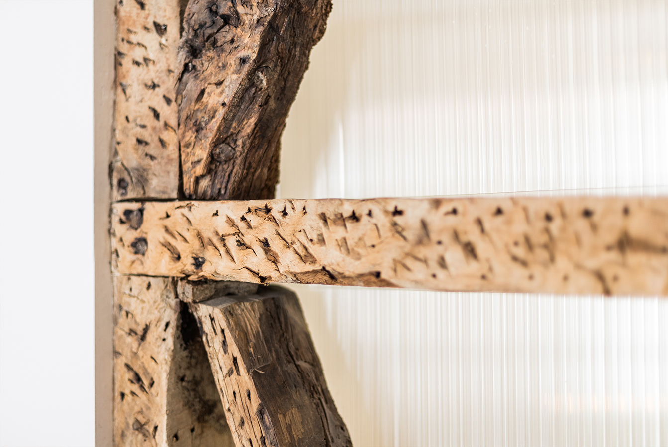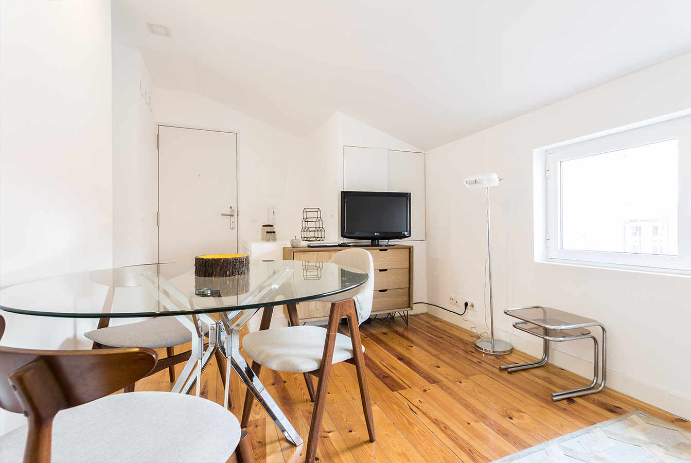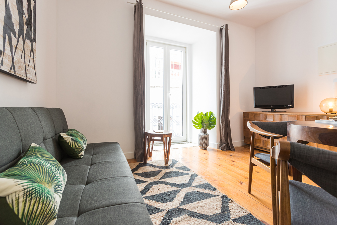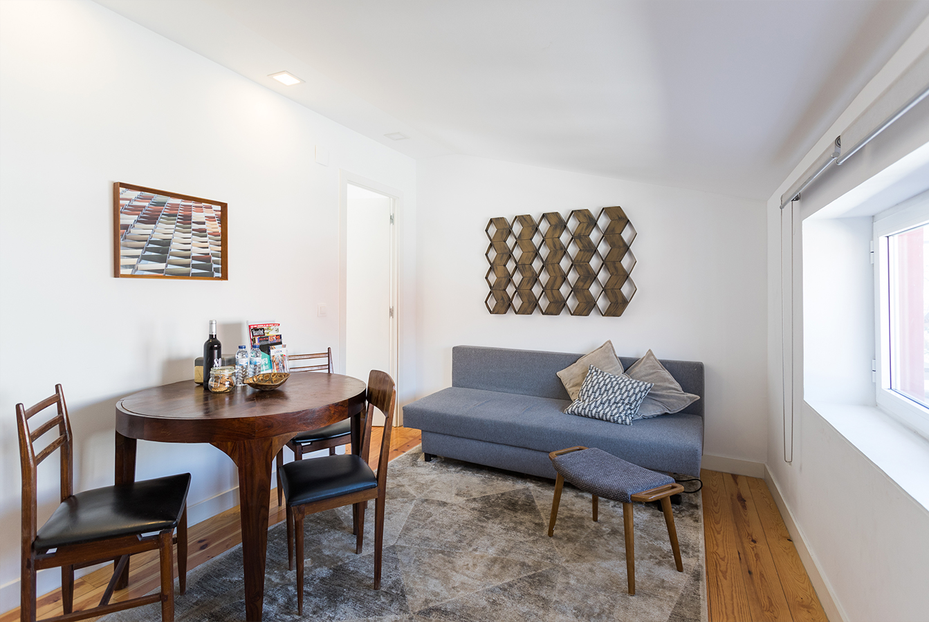 As estruturas de Cruz de Santo André, características deste edifício pombalino, foram mantidas como parte da decoração da habitação.