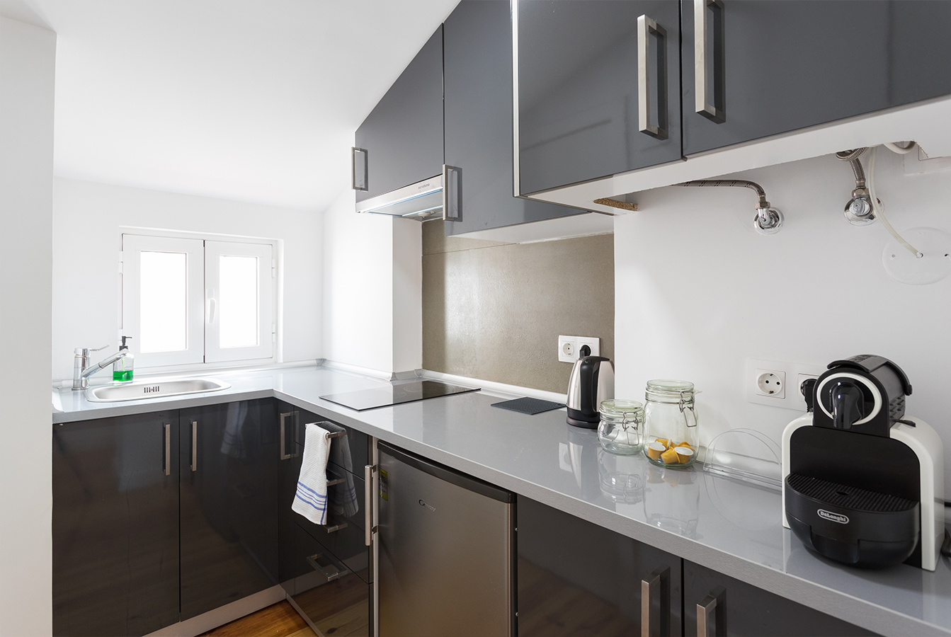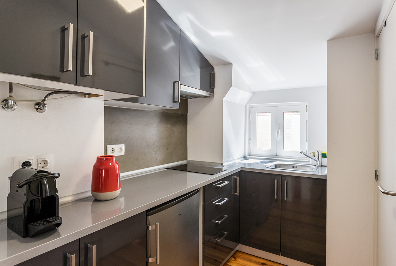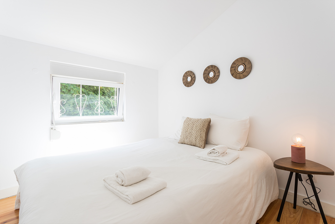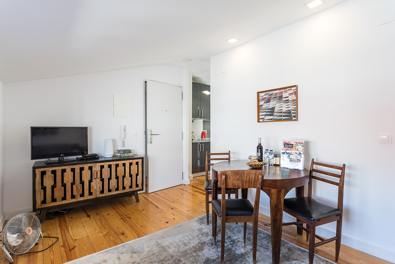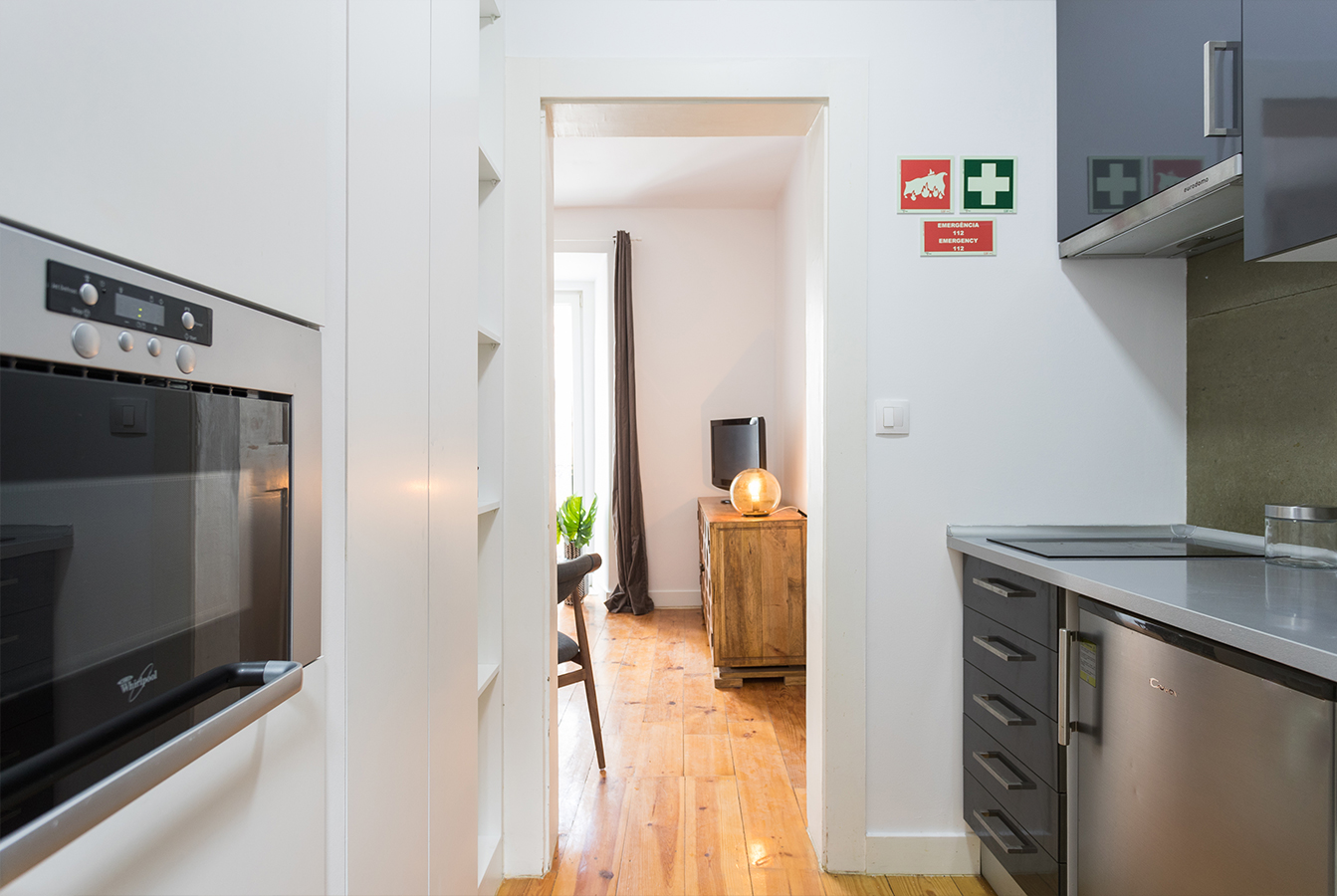As estruturas de Cruz de Santo André, características deste edifício pombalino, foram mantidas como parte da decoração da habitação.