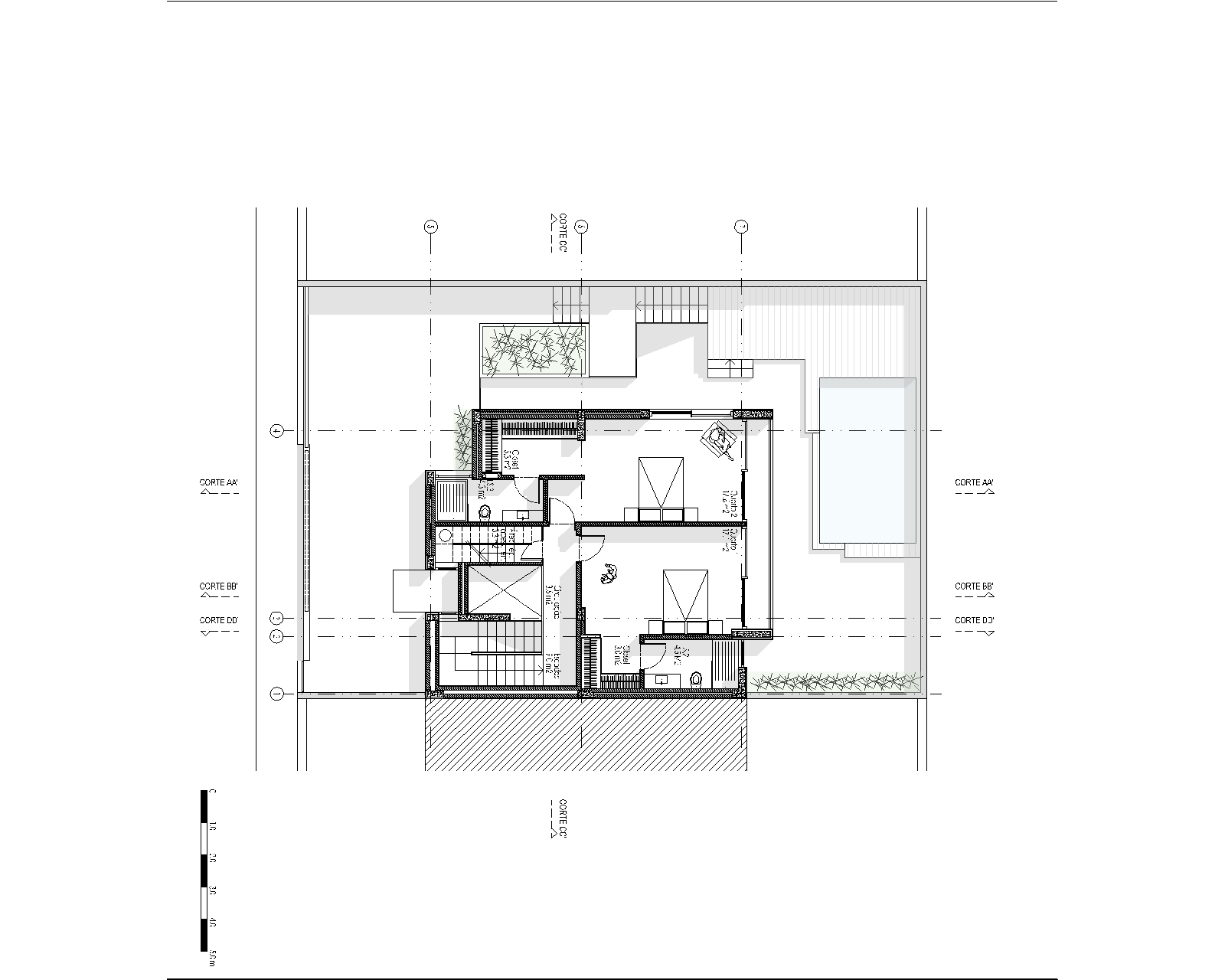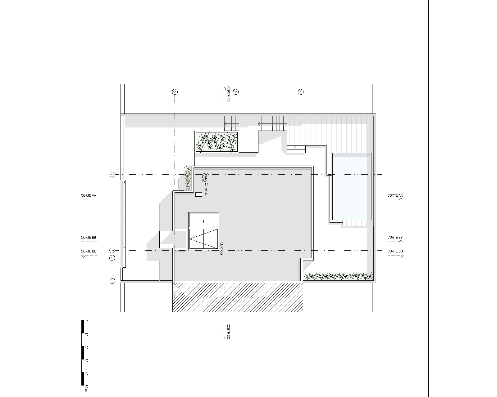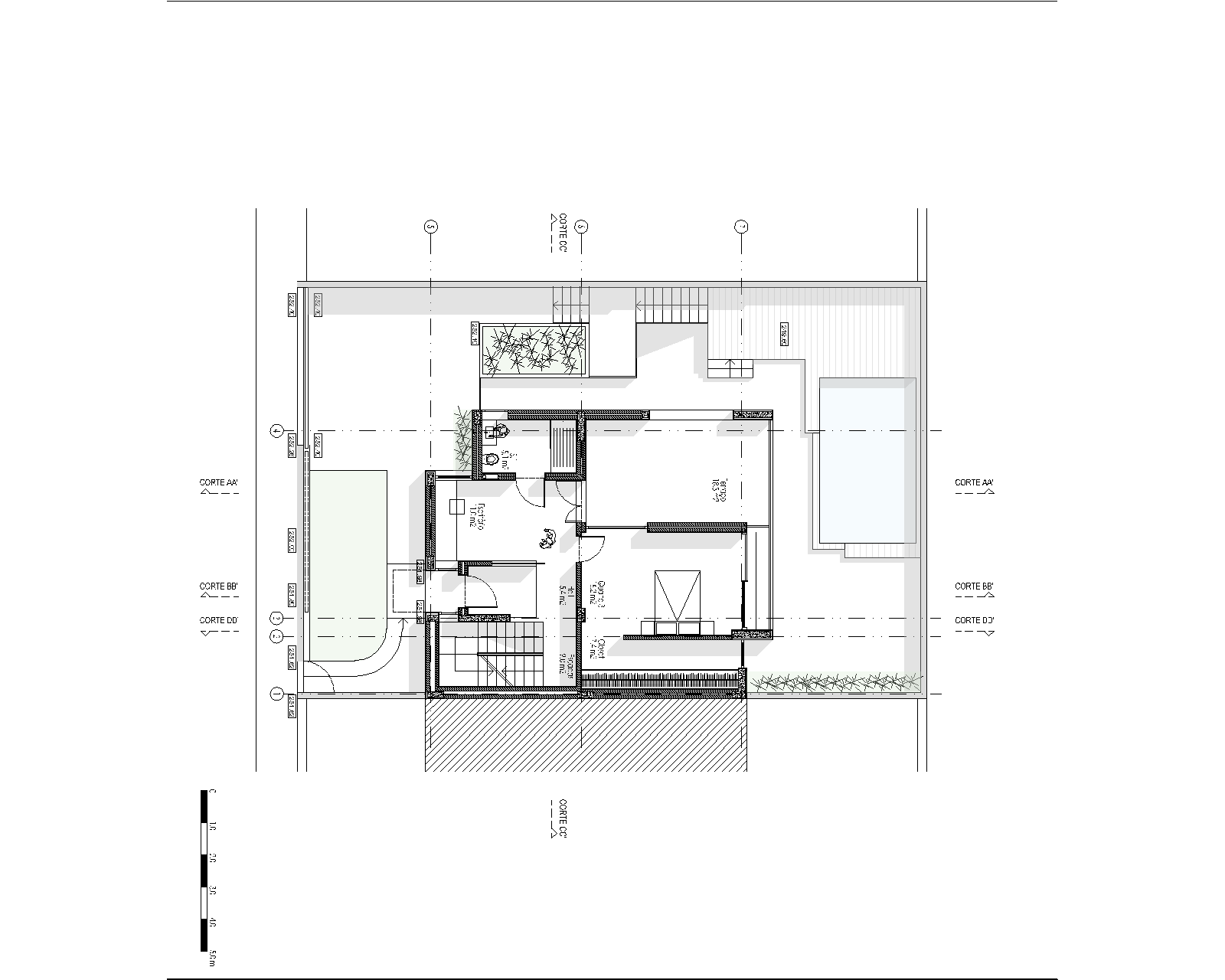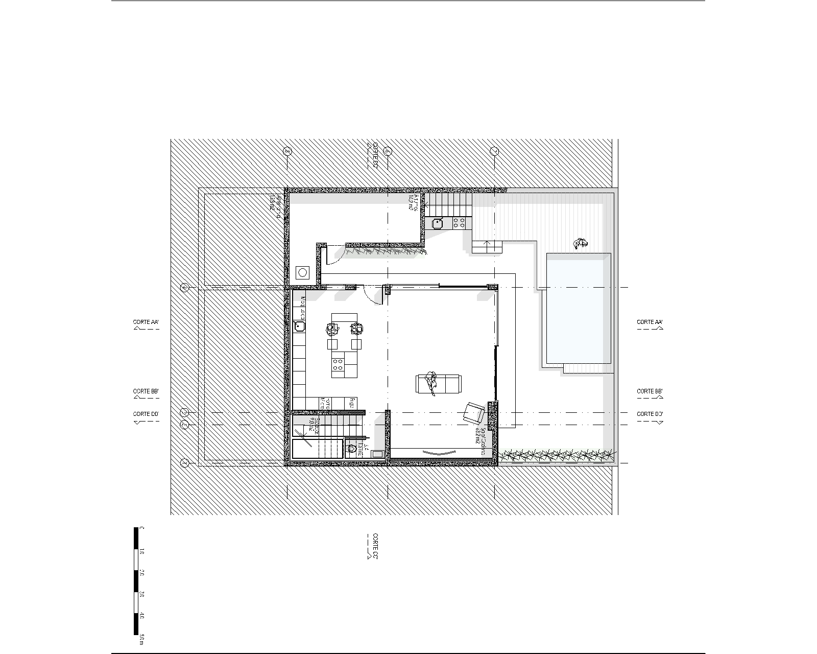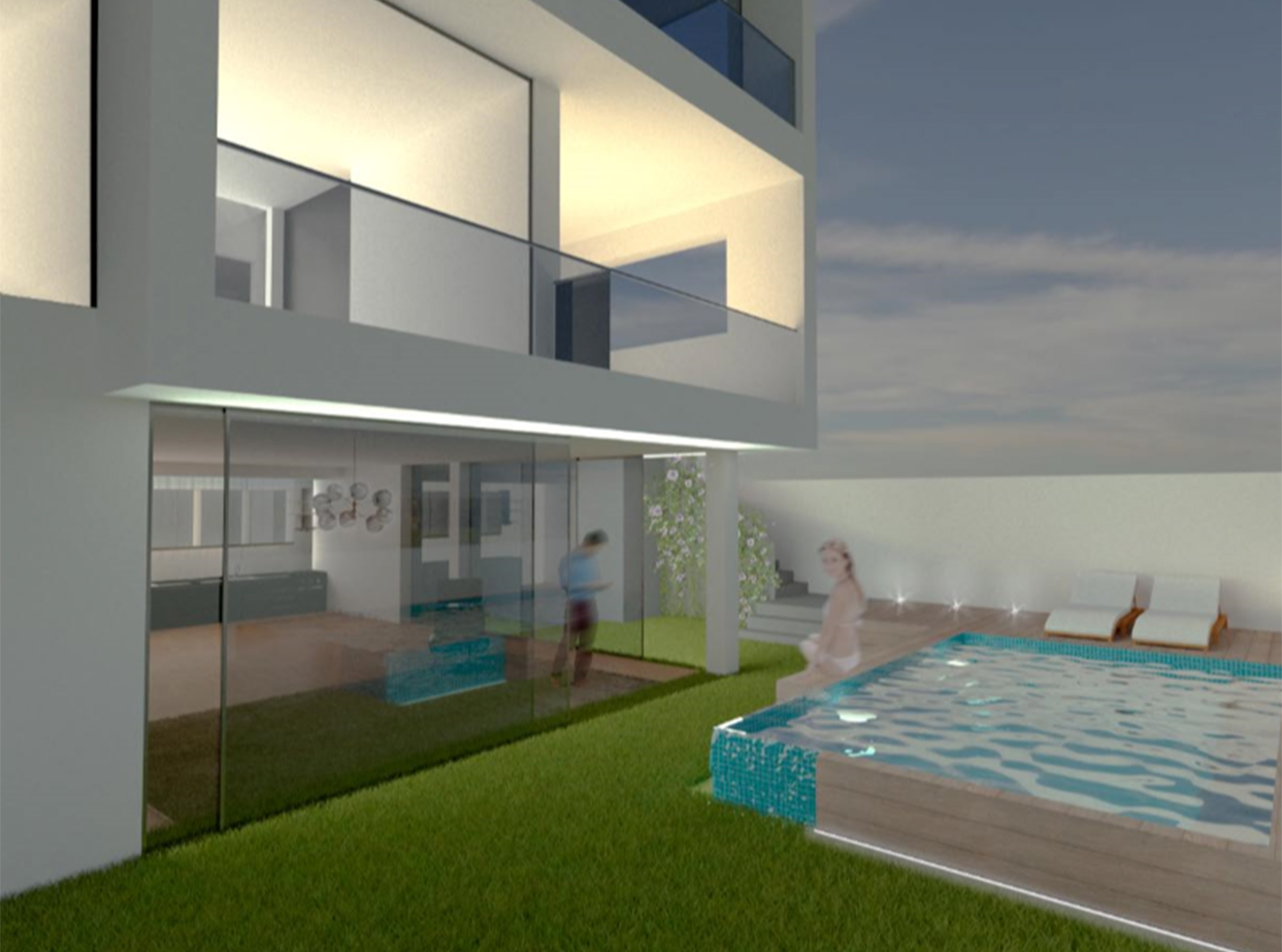Desenvolvimento de raiz de projeto para vivenda situada na zona de Sinta, tipologia T3 que tem como principal desafio o facto de estar inserida em lotes estreitos e contíguos. Para o efeito, a solução a destacar foi a adoção de uma fachada principal opaca para garantir a privacidade e a segurança dos proprietários, concentrando-se os espaços sociais e privados na fachada contrária por forma a assegurar luminosidade das divisões e beneficiar de uma vista única para o Parque Natural Sintra-Cascais.
